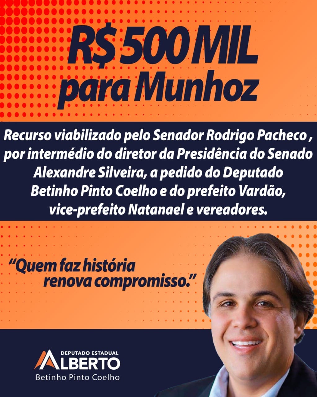 O MUNICIPIO FOI CONTEMPLADO COM RECURSO PARA A SAÚDE NO VALOR DE 500 MIL REAIS. Na data de ontem, 28 de julho, O nobre Deputado Estadual Alberto Pinto Coelho (Betinho), em reunião no gabinete do Presidente do Senado Rodrigo Pacheco, destinou pa...