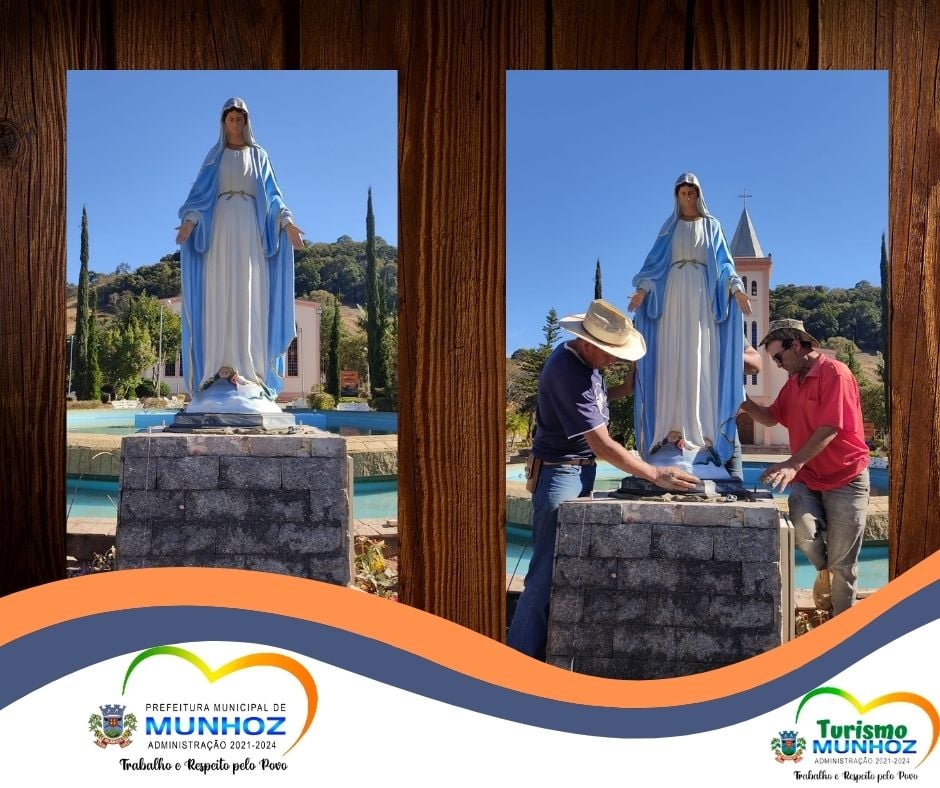 Na data de hoje, dando sequência no projeto de revitalização da praça Matriz de Munhoz, foi entregue a população a imagem de Santa Nossa Senhora das Graças na praça matriz do nosso município. Patrimônio Cultural e Turístico de nosso mu...