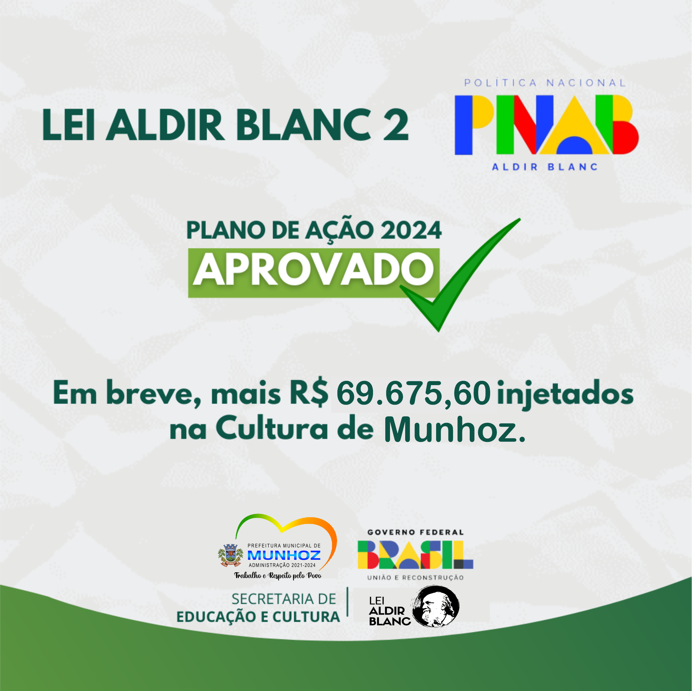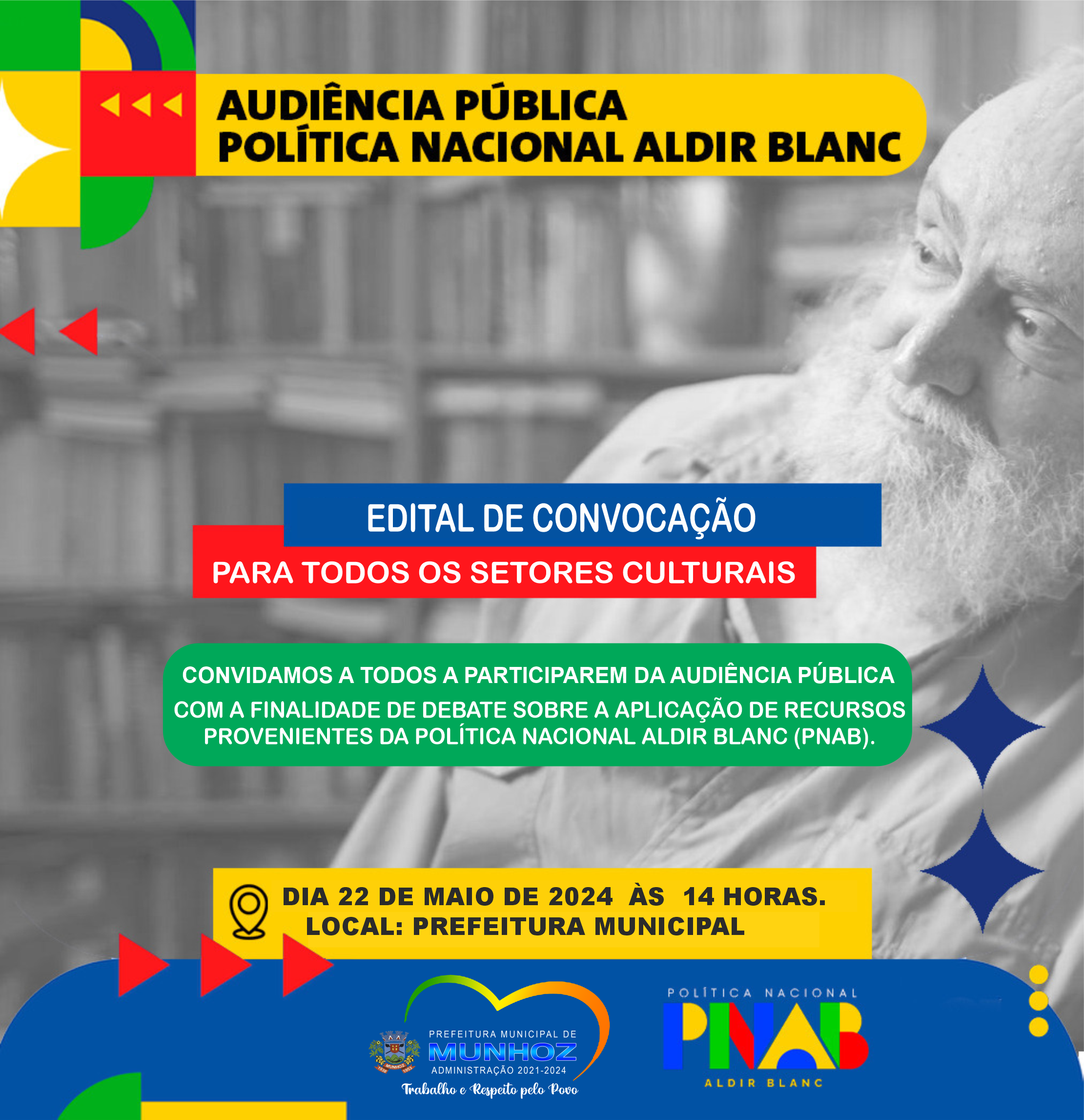 ✅ POLÍTICA NACIONAL ALDIR BLANC PNAB. 📝 A DIRETORA DO DEPARTAMENTO DE CULTURA DE MUNHOZ, NO USO DE SUAS ATRIBUIÇÕES LEGAIS QUE LHE SÃO CONFERIDAS PELA LEI ORGÂNICA MUNICIPAL CAP VI ART 195 E 196, CONVIDA A TODOS A PARTICIPAREM DA AUD...