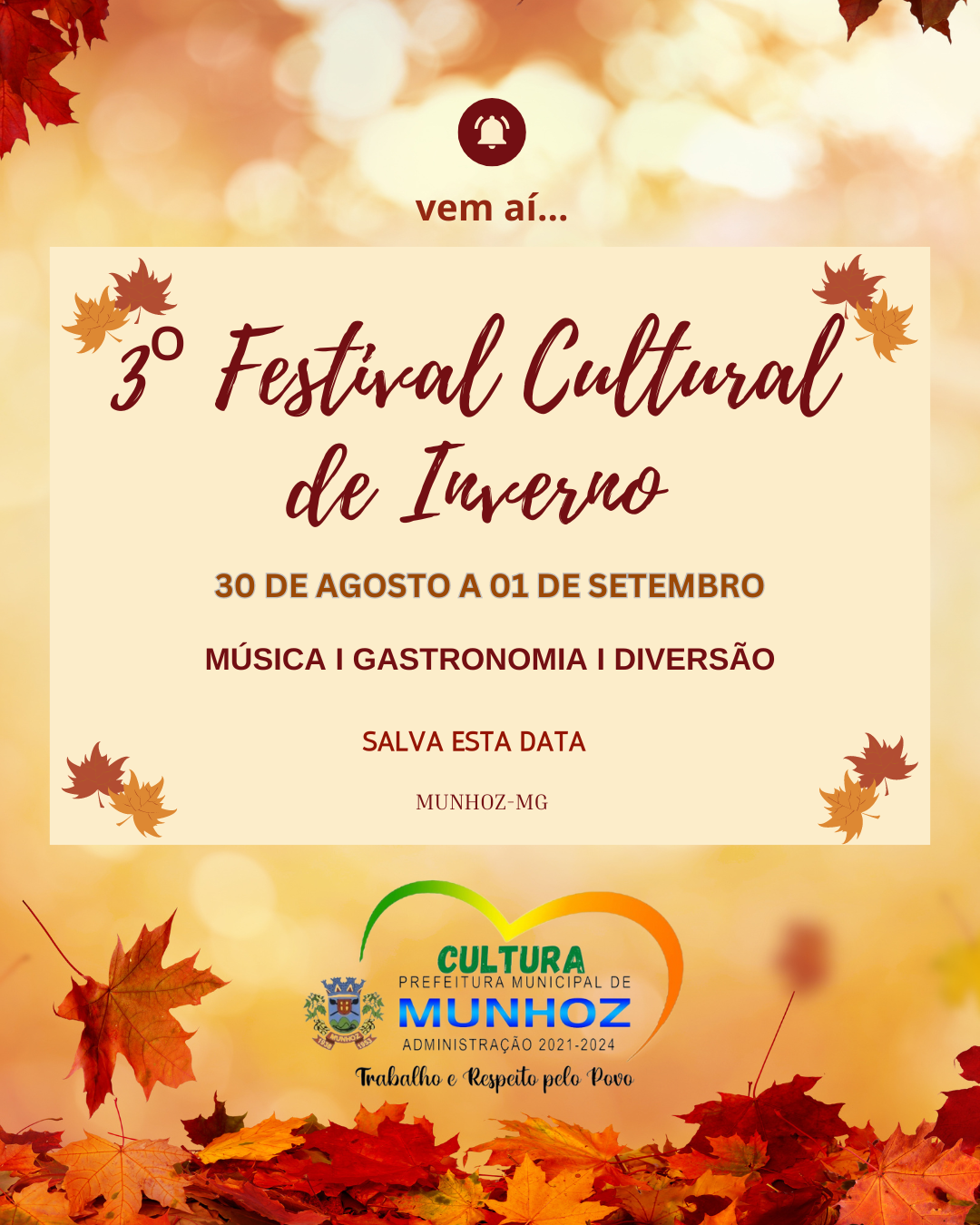 🍁Vem aí... 🍂 3º FESTIVAL INVERNO CULTURAL 🍂MUNHOZ-MG🍁 ✅ Salve esta Data: 🗓️ 30 de agosto a 01 de setembro de 2024❄️ 🔥 A terceira edição do evento promete agitar a cidade e aquecer este inverno, com muita música boa,...