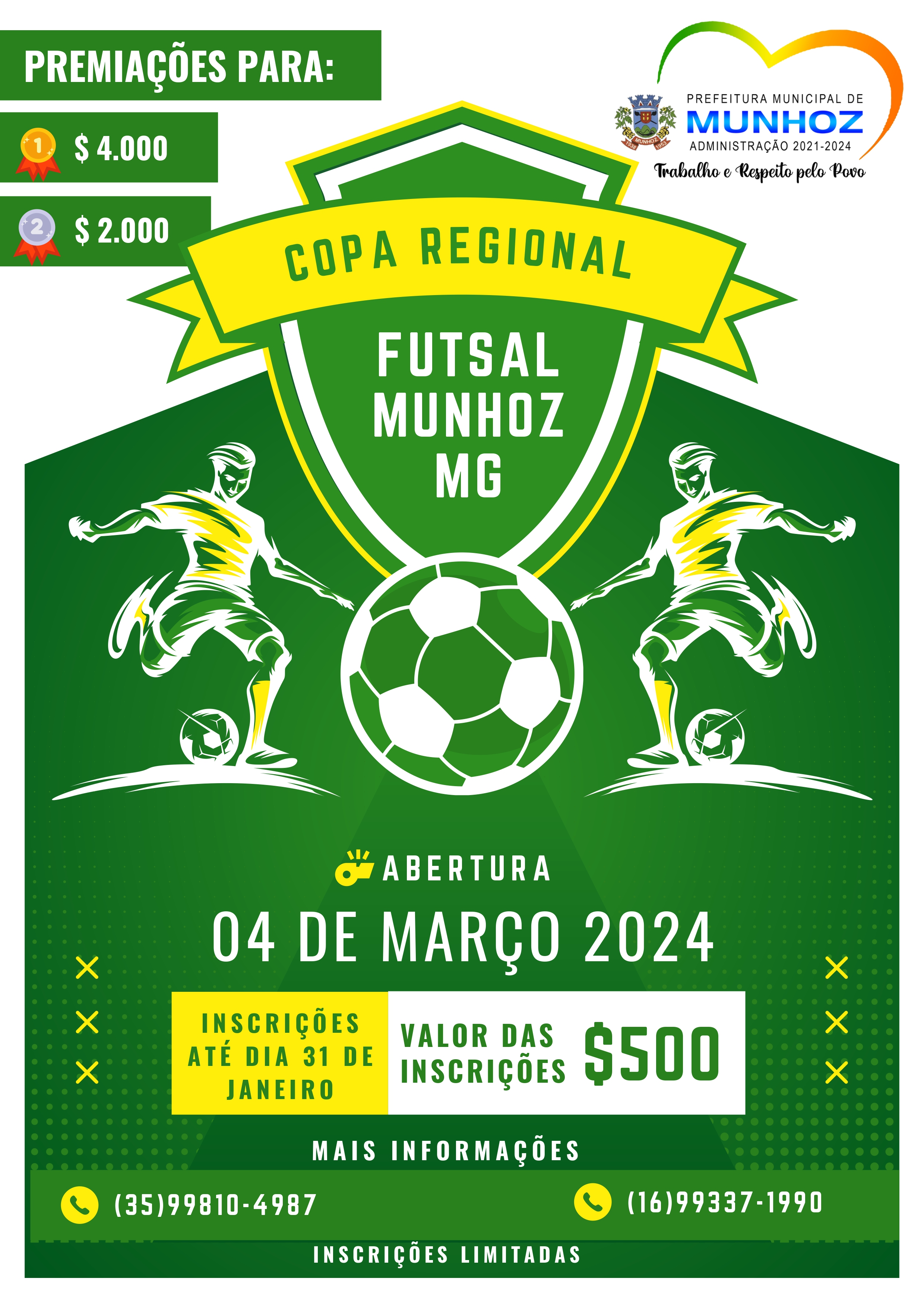 A Prefeitura de Munhoz por meio do Departamento de Esportes lança a COPA REGIONAL DE FUTSAL 2024 de Munhoz-MG. * * ⚽ INSCRIÇÕES ATÉ 31 DE JANEIRO. ⚽🏃🏻♂️ Interessados entrar em contato Whatsapp 📱 (35) 99810-4978 / (16) 9933...