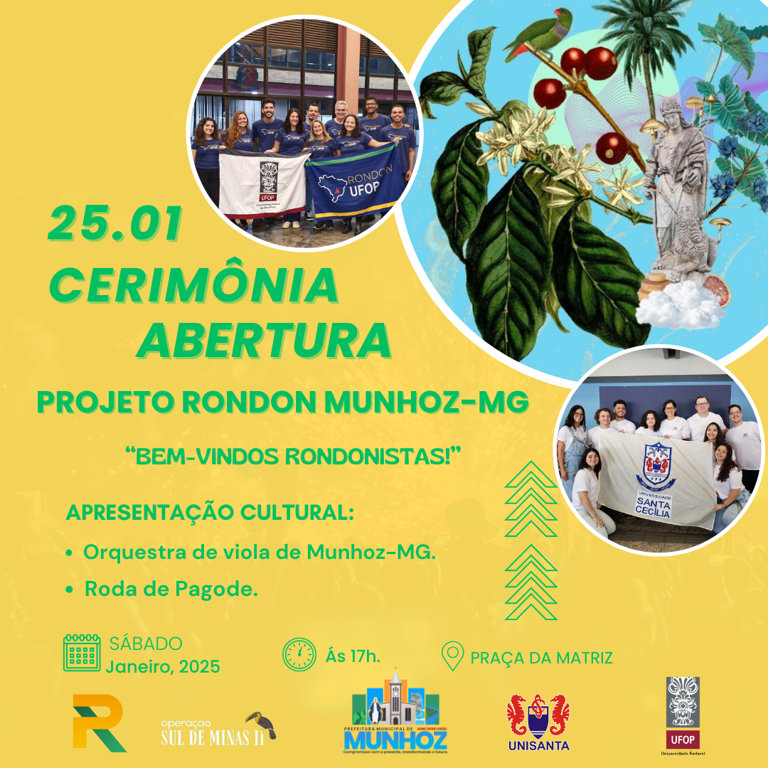 A Prefeitura de Munhoz convida toda a população para participar da cerimônia de abertura do Projeto Rondon, que será realizada neste sábado, 25 de janeiro, às 17h, na Praça da Matriz. O evento contará com apresentações culturais especia...