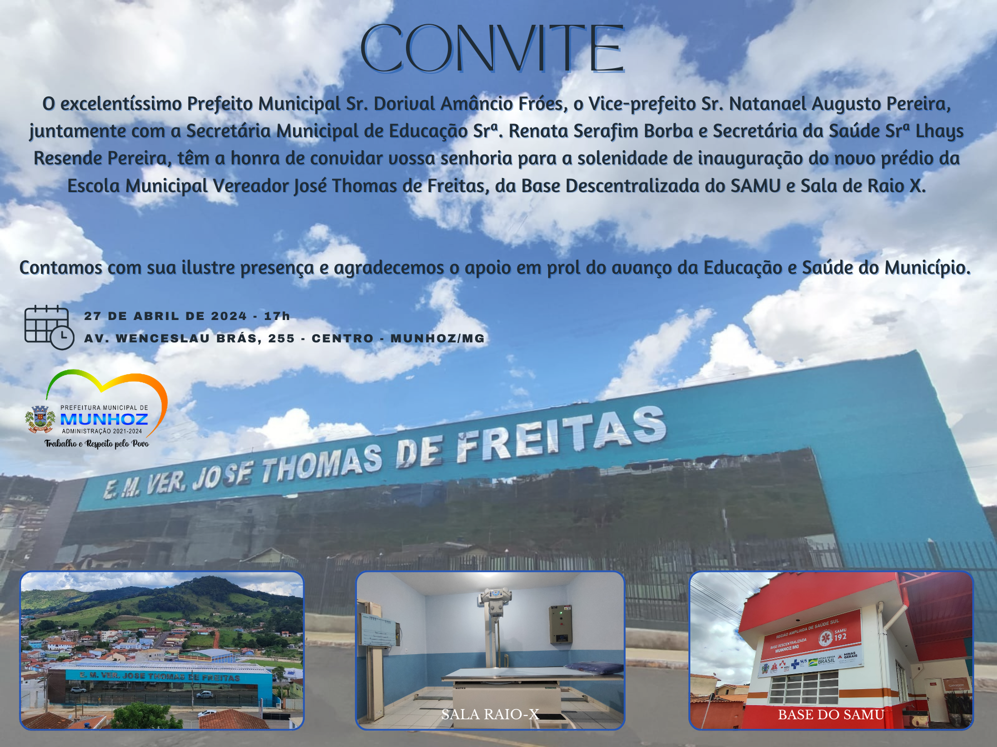 É com grande honra que a Prefeitura de Munhoz convida a toda a população, para a inauguração do novo prédio da Escola Municipal Vereador José Thomas de Freitas, da Base Descentralizada do Samu, da Sala de Raio-X, e entrega de mais 4 veícu...