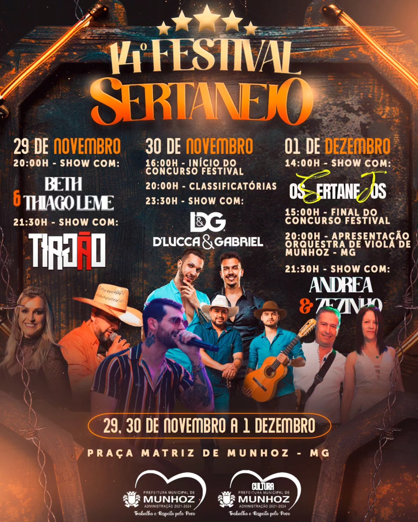 Vem aí o 14º Festival Sertanejo de Munhoz com uma programação especial que inclui shows incríveis, competição de violeiros, praça de alimentação variada e uma feirinha local com produtos regionais. De 29 de novembro a 01 de dezembro, pa...