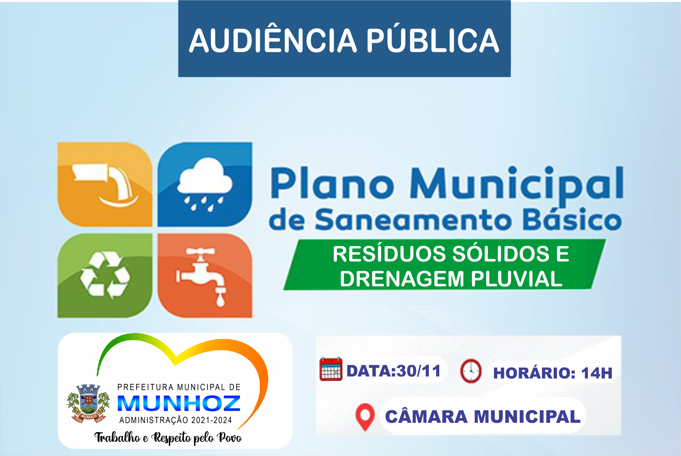 A Prefeitura Municipal de Munhoz, convida a toda a população para participar da Audiência Pública sobre o Plano Municipal de Saneamento Básico (PMSB), que será realizado dia 30 de novembro de 2021, na Câmara Municipal a partir das 14 horas...
