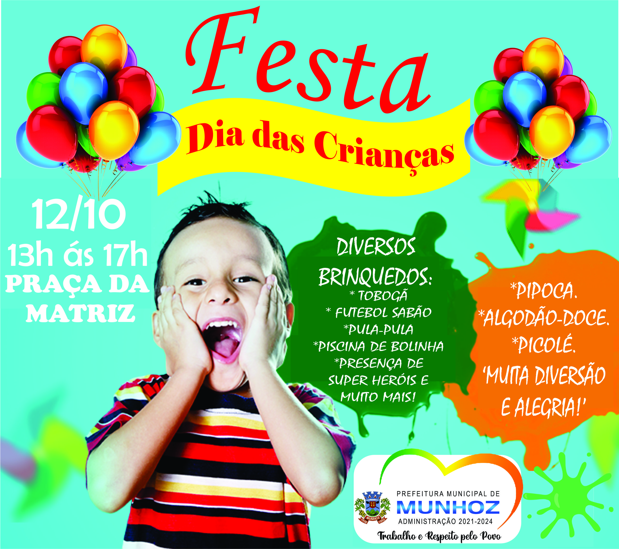 A Prefeitura de Munhoz, através da Secretaria Municipal de Educação promoverá a tradicional Festa do Dia das Crianças. E faz um convite especial para todas as crianças do Município, dia 12 de outubro, das 13h às 17h, na Praça da Matr...