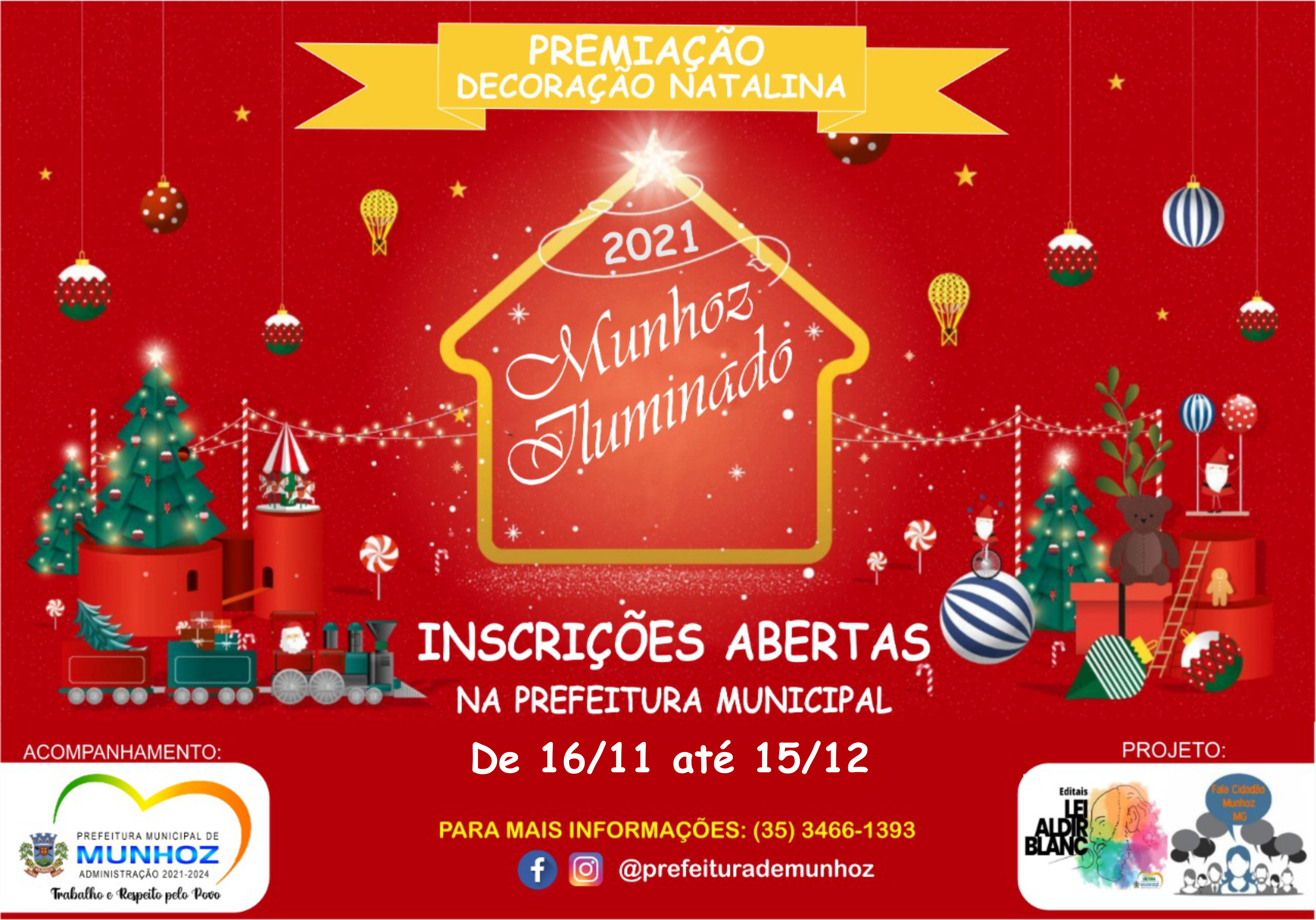 As inscrições para concorrer ao Concurso de Decoração Natalina Munhoz iluminado 2021, iniciará a partir de 16 de no...